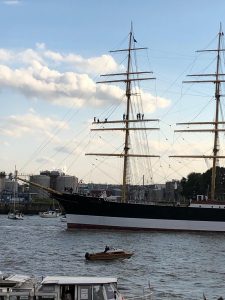 Nach vielen bewegenden Jahren mit unterschiedlichsten “Heimathäfen” liegt die PEKING jetzt unweit ihrer Geburtsstätte. Am 9. September 1932 von der Reederei Laeisz nach Rochester in England verkauft und von Käpt’n Jürs dorthin überführt, wurde sie zum stationären Schulschiff umgebaut. Zwischenzeitlich (1964) drehte man sogar den Film “Mörder Ahoi” (mit der wohl berühmtesten Miss Marple Darstellerin: Margret Rutherford) auf der PEKING. Als sich das Schiff nicht mehr bewirtschaften ließ, wurde es am 31. Oktober 1974 nach New York verkauft. Ab Juli 1975 war der Pier des South Street Seaport Museum ihre Heimat. Dort, wenig liebevoll behandelt, wäre die PEKING wohl alsbald verrottet und verschrottet worden. Aber 2016 übernahm die Stiftung Hamburg Maritim die PEKING und auf einem Dockschiff erreichte sie die Wewelsflether Werft.