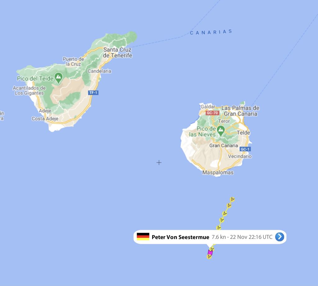 Nach ihren ersten 200 sm (Stand 23.11 22:00) lag die „Peter von Seestermühe“ nach gesegelter Zeit an Position 11. der Cruiser, 23. over all. Heute, 25.11. liegt sie schon an Position 20.