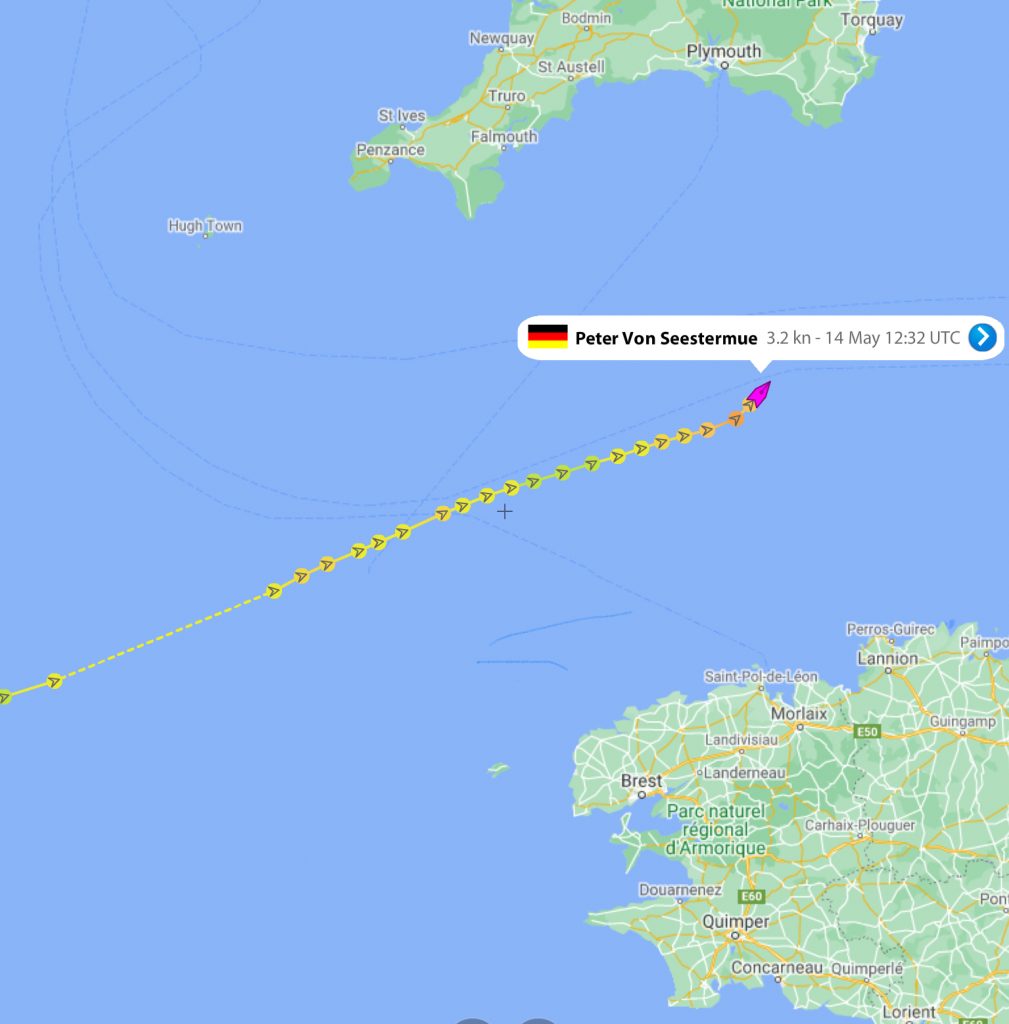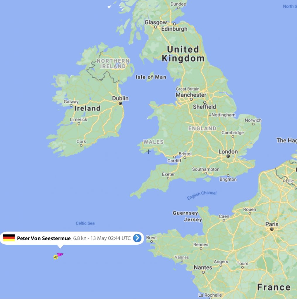 Die Peter von Seestermühe ist seit 7.5.2021 auf der zweiten Etappe des Rückweges aus der Karibik. In der ersten Etappe ging es von Antigua auf die Azoren.