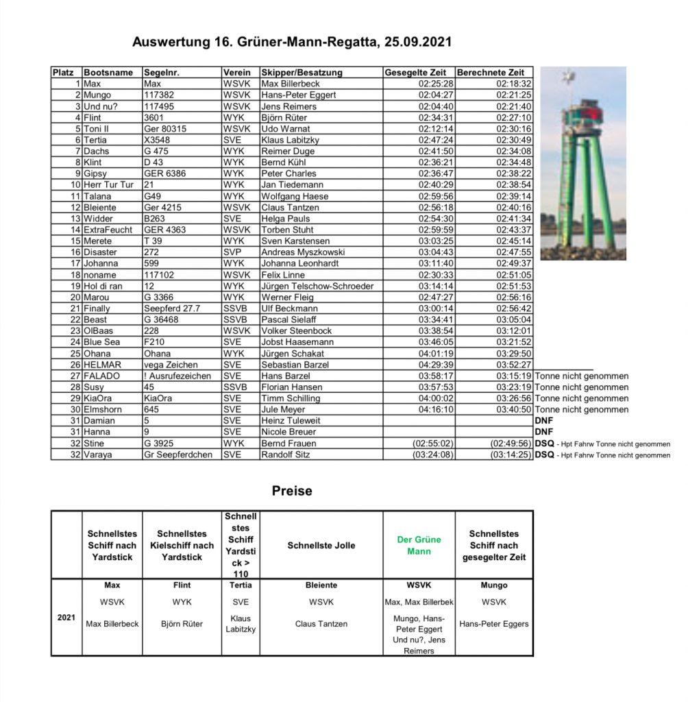 Ersegelt wurde der „Grüne Mann“ 2021 für den WSVK von Max mit Max Billerbeck, Mungo mit Hans-Peter Eggert und Crew, sowie und nu? mit Jens Reimers und Crew.